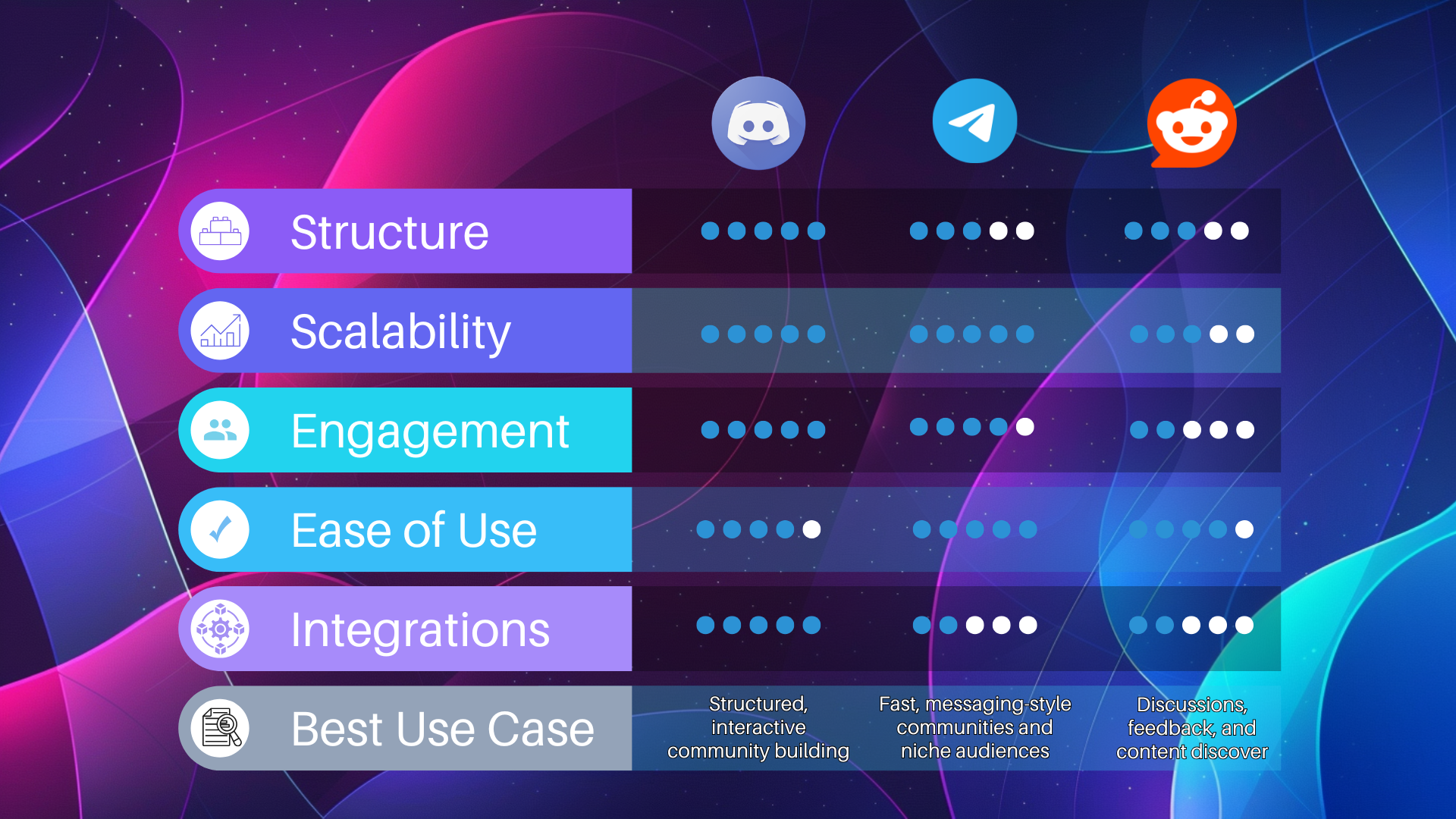 For most use cases, Discord offers the best balance between structure, engagement, and scalability, making it the strongest option for long-term community building.